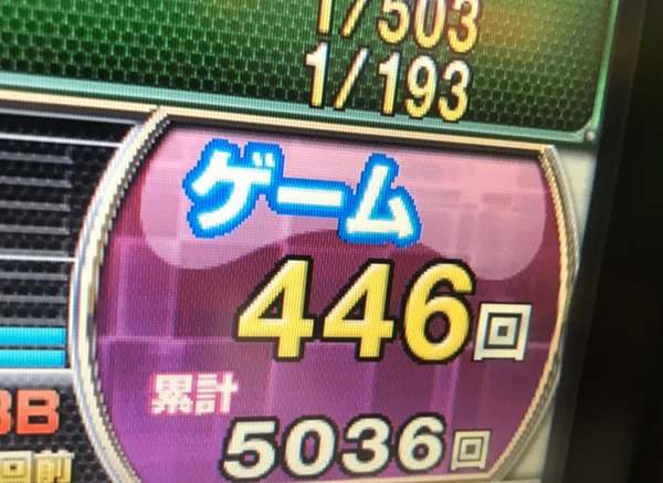 1時間あたり750Gを消化するペースでゲーム数を稼いでいき、お昼頃には2200Gを通過。午後にはいってからも勢いを落とさずにレバーを叩いたおかげで、楽々と折り返し地点となる5000Gを突破した。