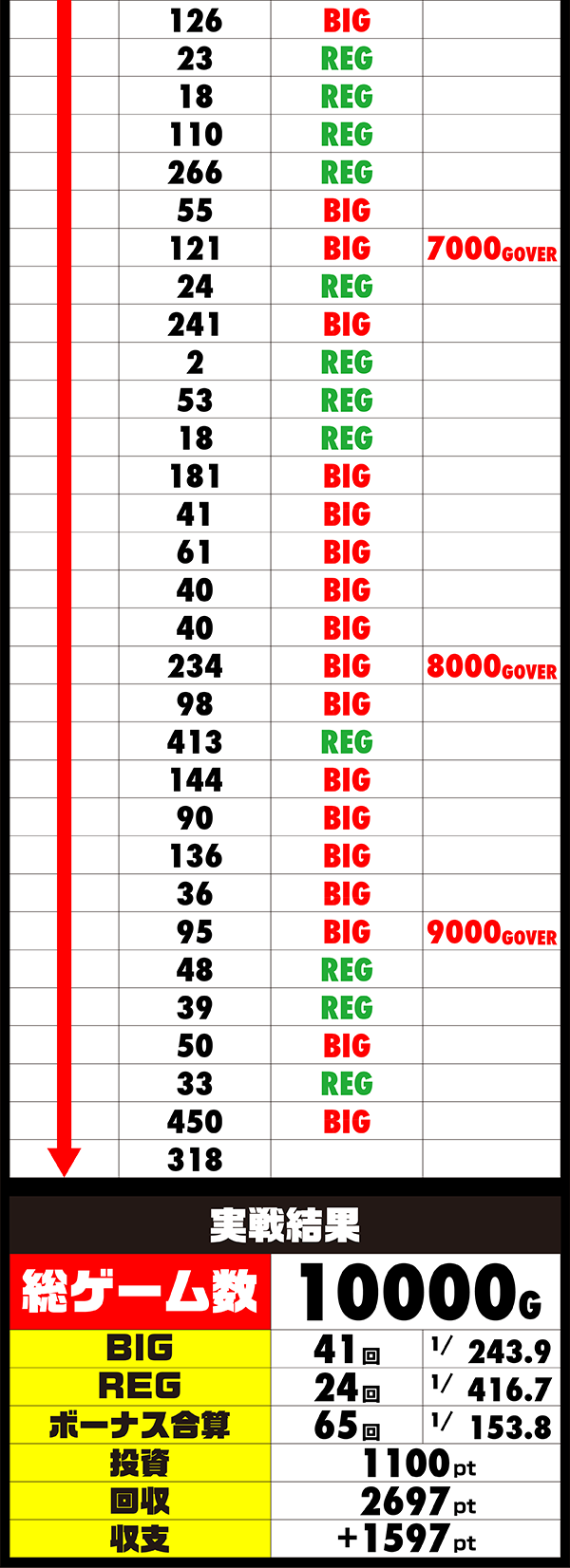 1000GのあいだにBIG8回、REG4回に当選し、成功と勝利のダブル達成にも期待ができる状況となっていた。