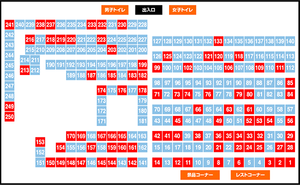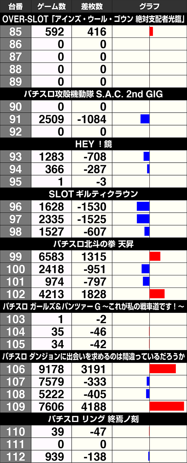 全体で250台中90台がプラス。『Re:ゼロから始める異世界生活』や『SLOT劇場版魔法少女まどか☆マギカ[新編]叛逆の物語』が設置されているシマは半数以上の台がプラスを記録した。