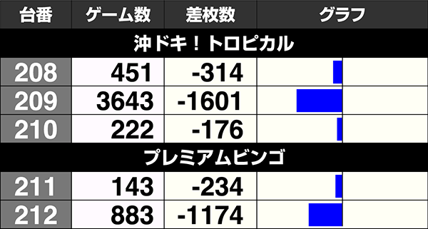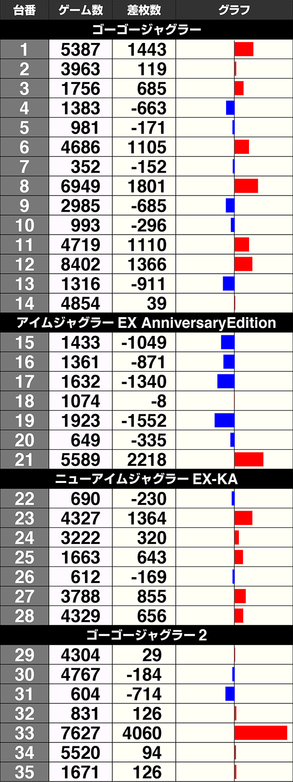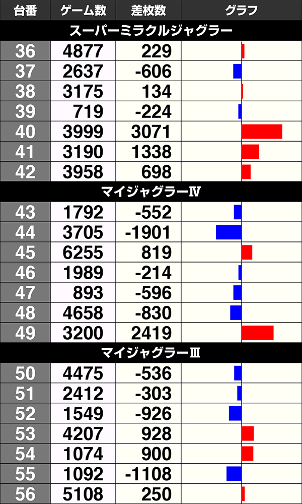 7機種が設置されているジャグラーシリーズは、『ニューアイムジャグラーEX-KA』と『ゴーゴージャグラー2』、『スーパーミラクルジャグラー』の3機種が7台中5台プラス。