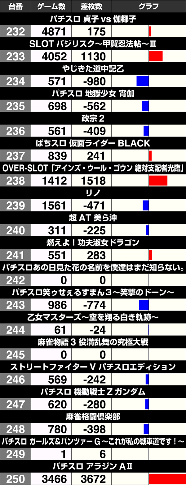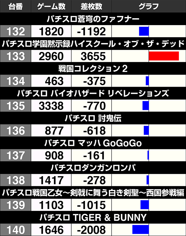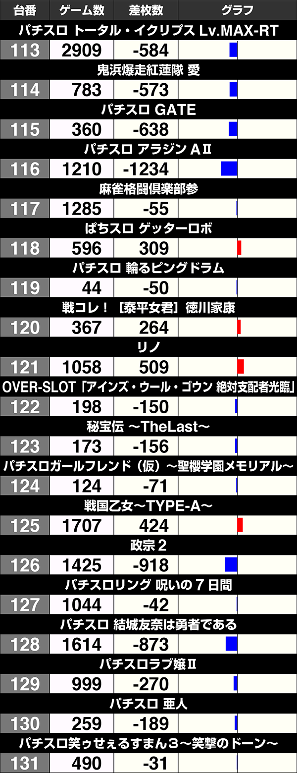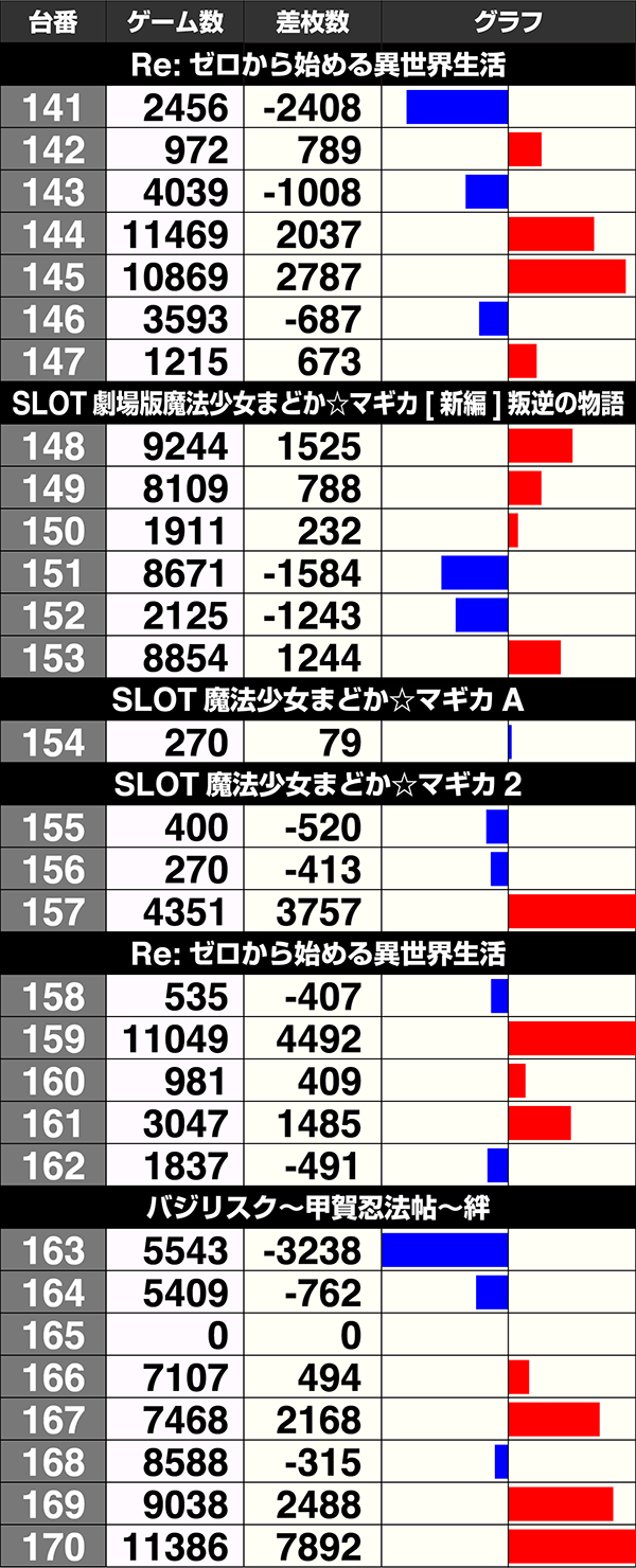 8台中4台がプラスの『バジリスク~甲賀忍法帖~絆』も含め、141番台から170番台は30台中17台がプラスであった。