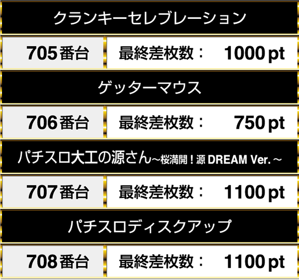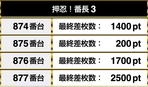 人気を集めていた『押忍!番長3』は2500ptを含めて、4台が固まってプラスptを記録!