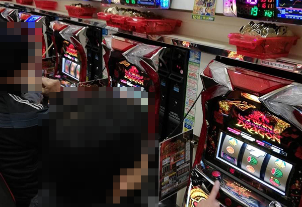 午後のパチスロで、もっとも存在感を放っていたのが「ツインドラゴンハナハナ‐30」。パフォーマンスを披露しているプレイヤーが多く、大きな盛り上がりに包まれていた。