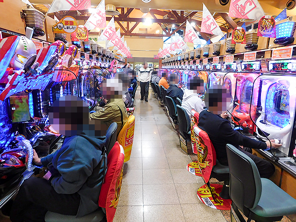 店内には老若男女を問わずプレイヤーが集合。パチンコ・パチスロの各シマから活気が感じられた。