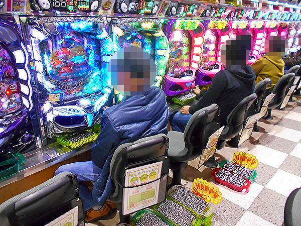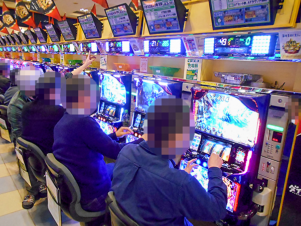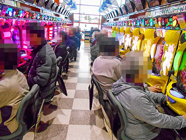 取材時は既に多くのプレイヤーが集結し、パチンコ・パチスロを問わずにぎやかな状況となっていた。