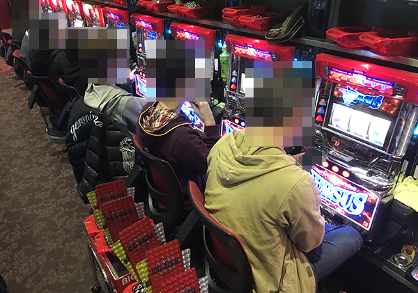 18時頃のホール内には、パチンコとパチスロの両方に笑顔をみせる姿があった。