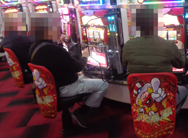 午後のパチスロでは、「マイジャグラーⅣ」がとくに人気。パフォーマンスを披露しているプレイヤーが多く、目立つ存在となっていた。
