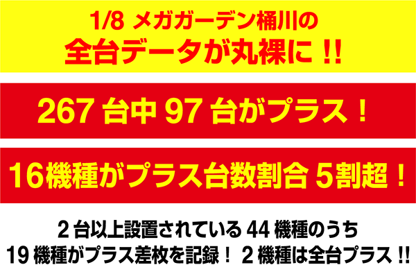 1月8日の「メガガーデン桶川」は267台中97台がプラスを記録。
