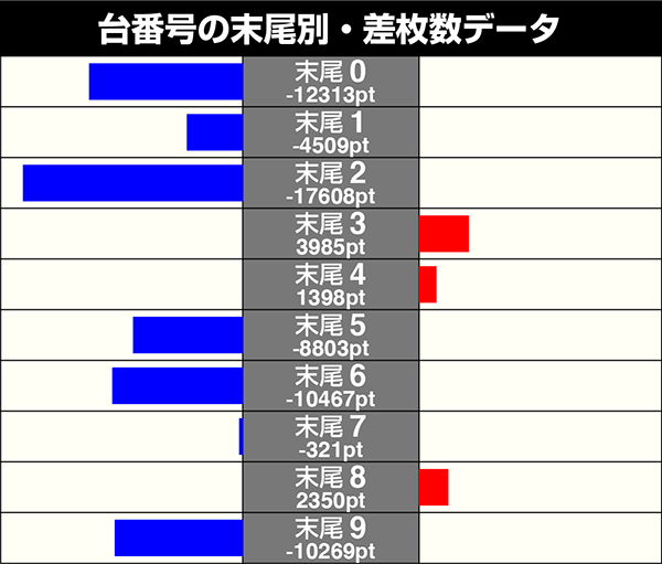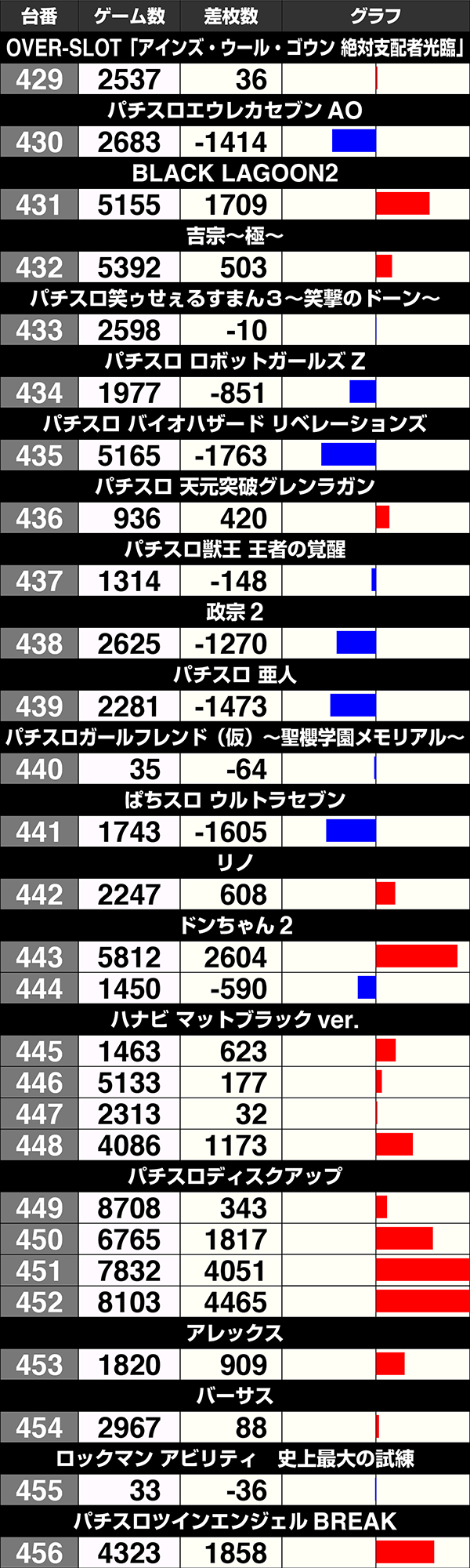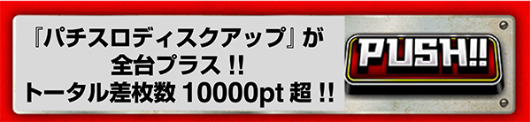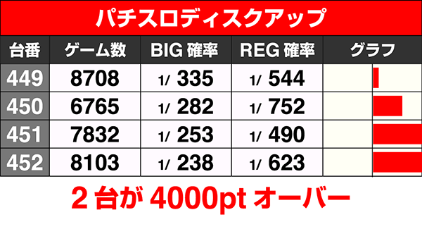 合計ポイントが10000を上回った『パチスロディスクアップ』は、451番台と452番台の2台がプラス4000ptオーバーを記録。