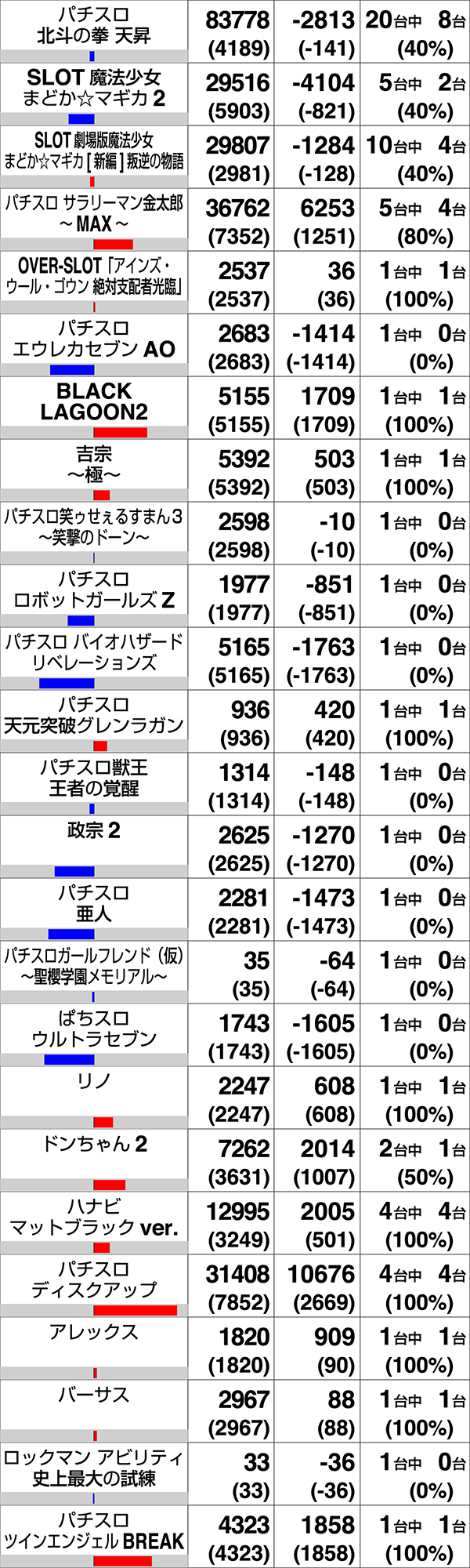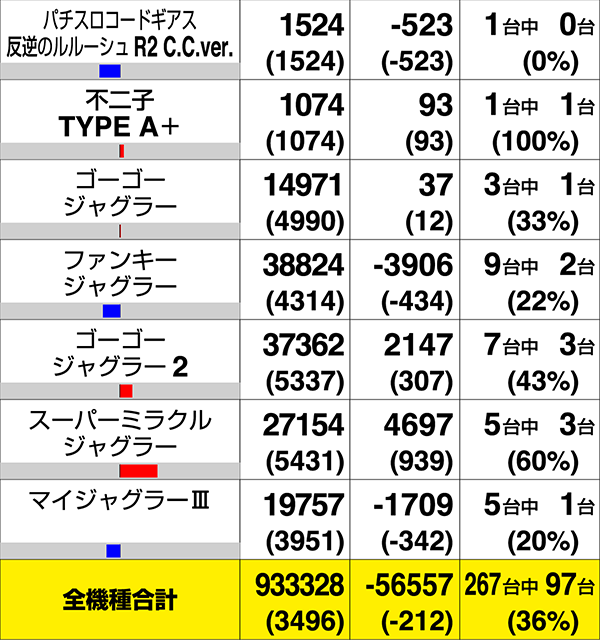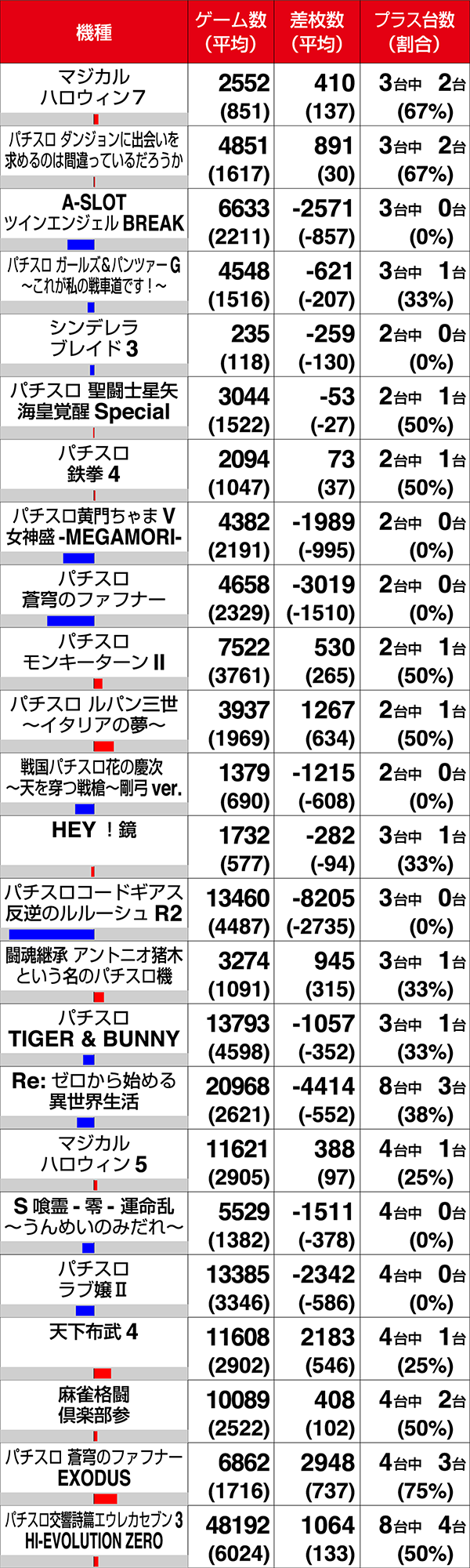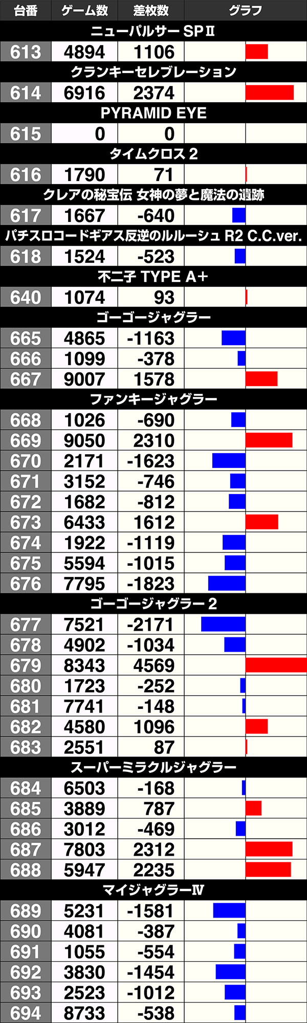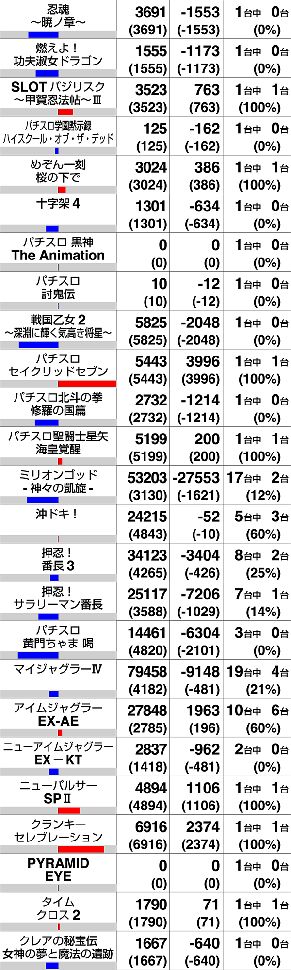 4台すべてがプラスの『パチスロディスクアップ』、5台中4台プラスの『パチスロ サラリーマン金太郎~MAX~』、5台中3台プラスの『スーパーミラクルジャグラー』など、19機種の差枚数がプラスであった。