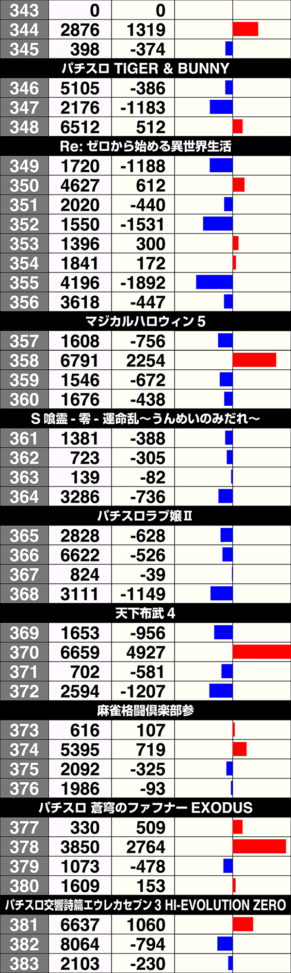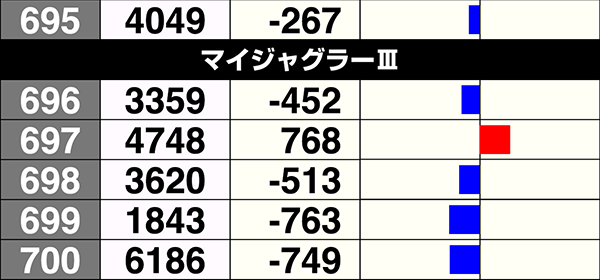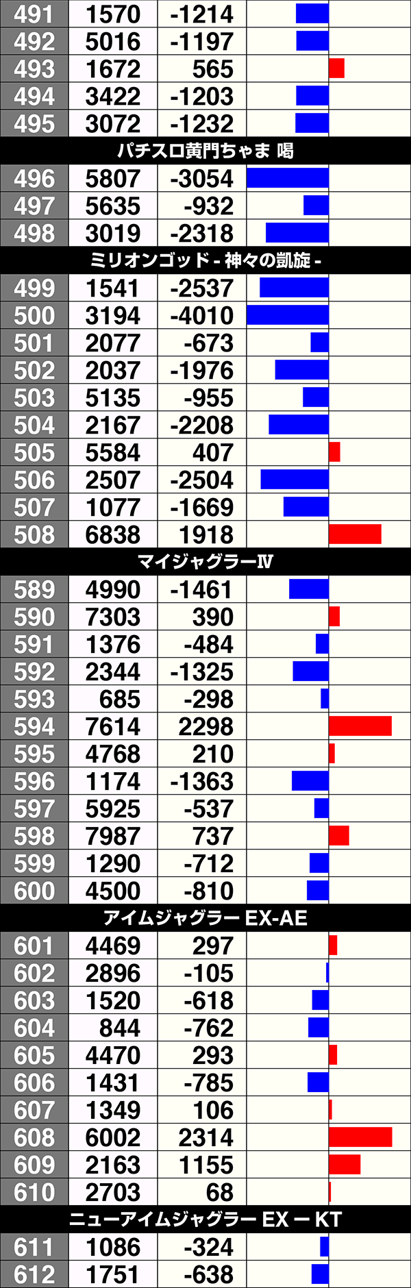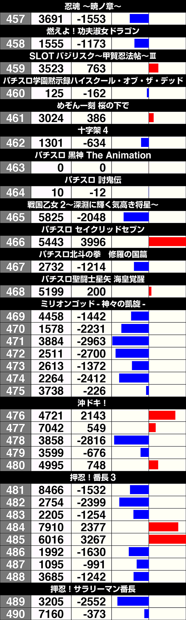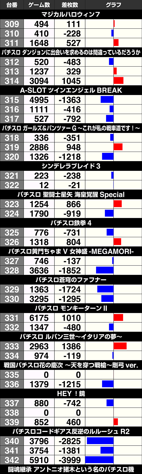 4台すべてがプラスの『パチスロディスクアップ』、5台中4台プラスの『パチスロ サラリーマン金太郎~MAX~』、5台中3台プラスの『スーパーミラクルジャグラー』など、19機種の差枚数がプラスであった。