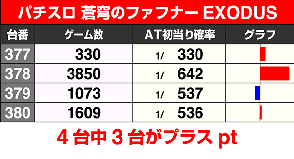 4台中3台がプラスの『パチスロ 蒼穹のファフナーEXODUS』は、全体的にゲーム数が伸びれば、よりにぎわうのではといった印象を持った。