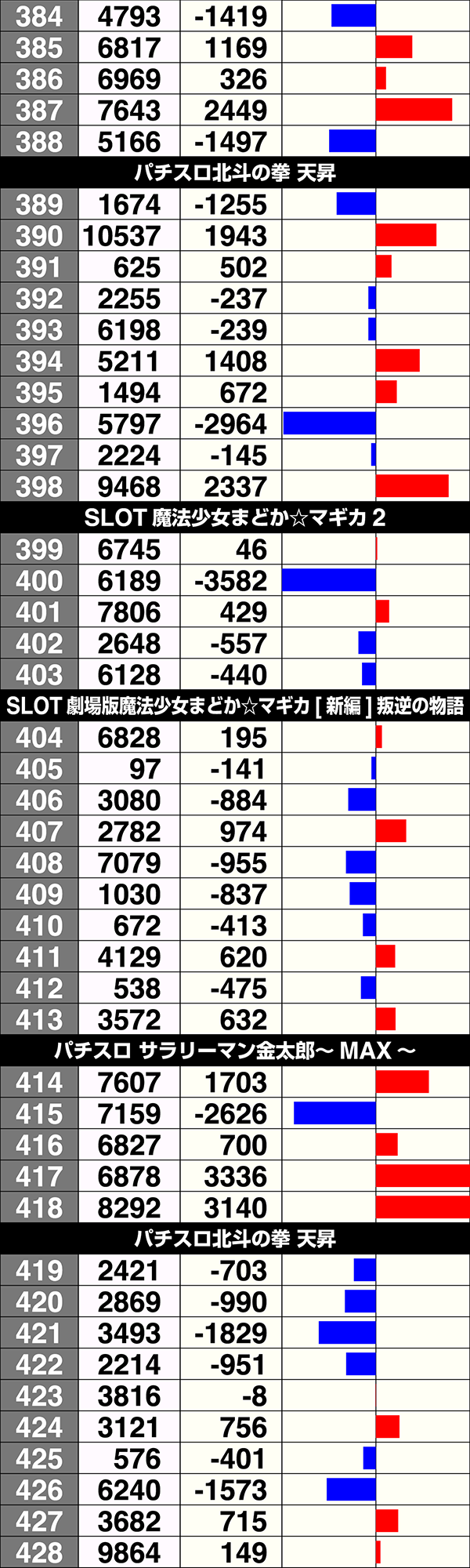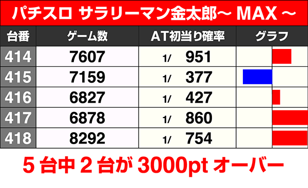 『パチスロ サラリーマン金太郎~MAX~』は合計6000ptオーバー。うち417番台と418番台が3000ptオーバーを記録していた。