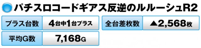 また、『パチスロコードギアス反逆のルルーシュR2』は、全台差枚数こそマイナスになってしまったが、台の挙動は悪くなかったことを付け加えておきたい。