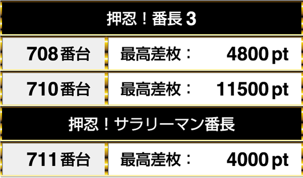 前回と同様に3台以上の並びでプラスptを記録する機種のなかには、すべて2000ptを上回る場所もあった!!