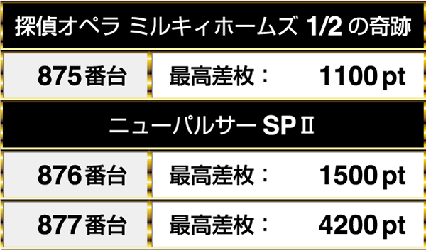 新台の『探偵オペラ ミルキィホームズ 1/2の奇跡』の1台は、『ニューパルサーSPⅡ』の2台と連なってプラスpt!!