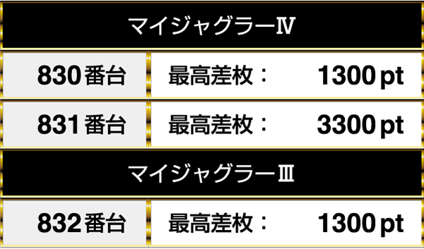閉店時には830番台から832番台までの3台が連なってプラスptとなり、1000pt以下のデータはナシ!