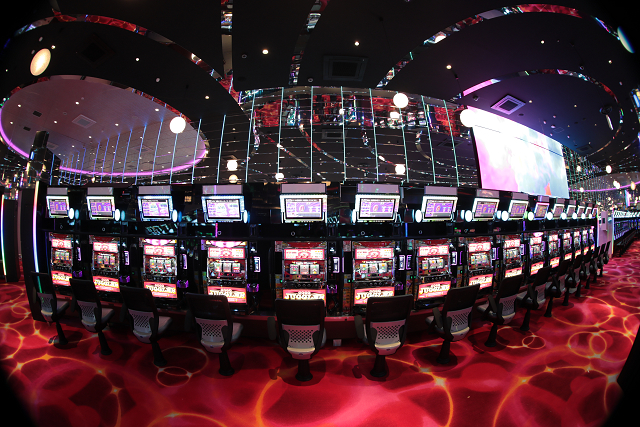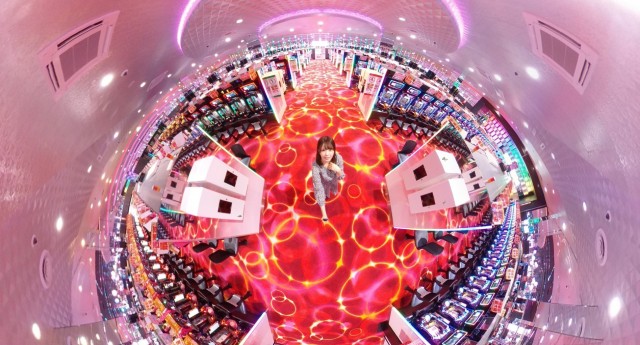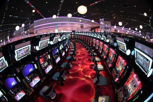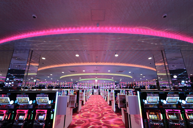隣接するタワーパーキングから繋がるメインエントランス。ここから店内に入ると、まずは広大なパチンコエリアが目の前に広がる。