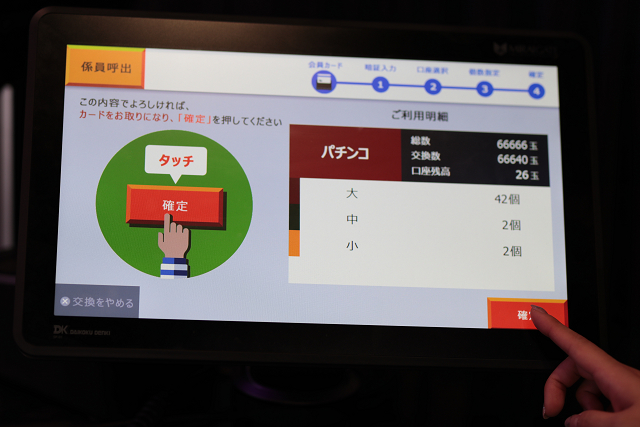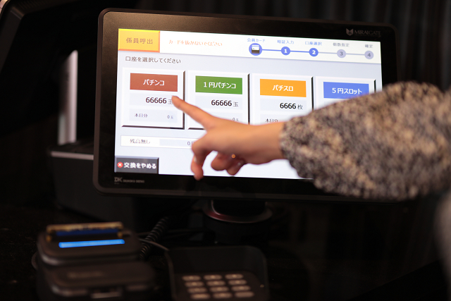 全台各台計数機なので玉やメダルをジェットカウンターに流す手間も省け、遊技終了は貯玉機能を持つ会員カードを抜きとるだけで済む。