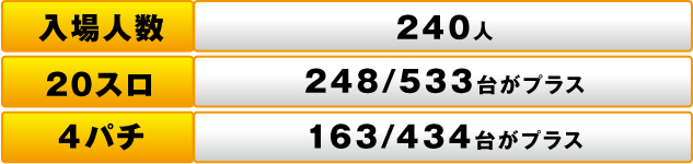 しかし、全体的に振るわず、パチンコ全体では434台中163台がプラスだったものの、トータルの差玉数は-872,340発という、記録的なマイナスを喫してしまった。