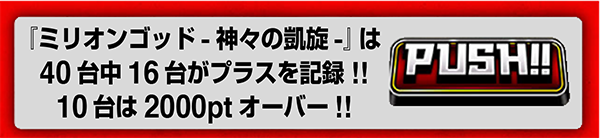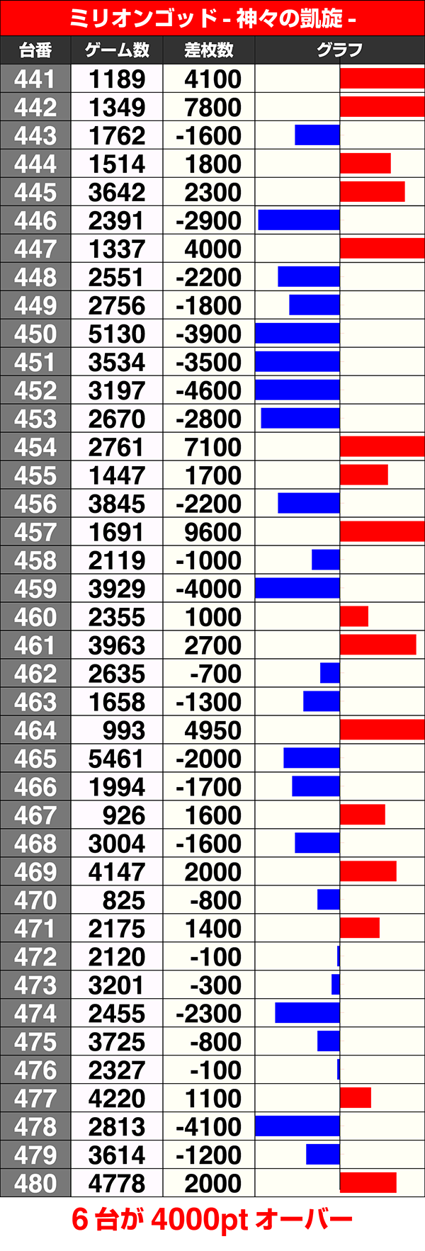 『ミリオンゴッド-神々の凱旋-』は6台が4000ptオーバー。もっとも多かったのは457番台の9600ptであった。