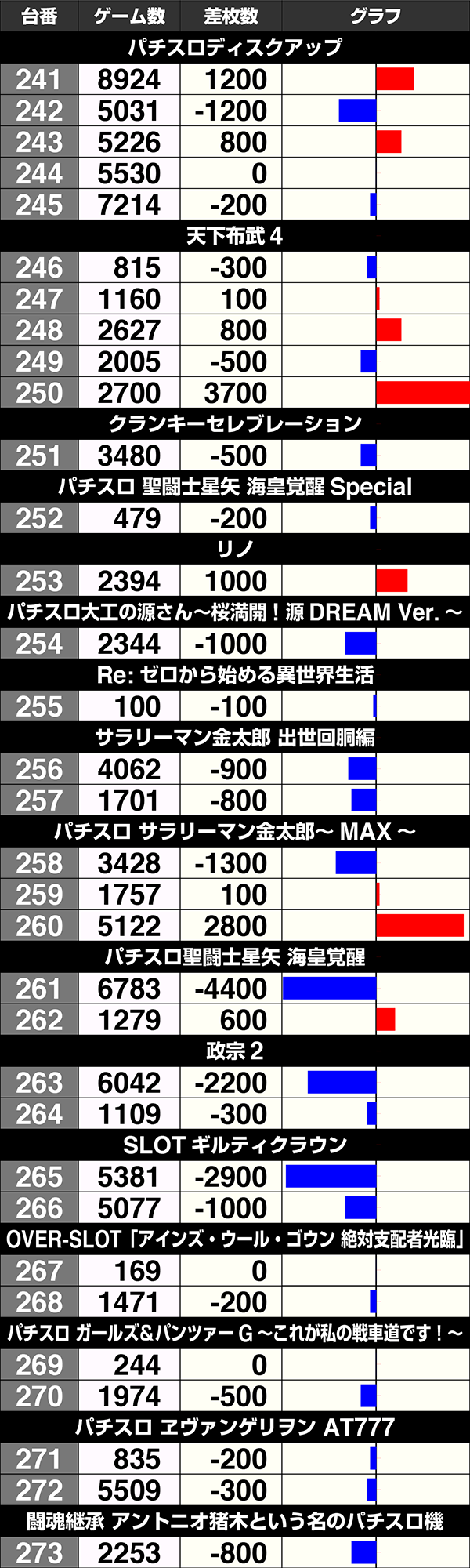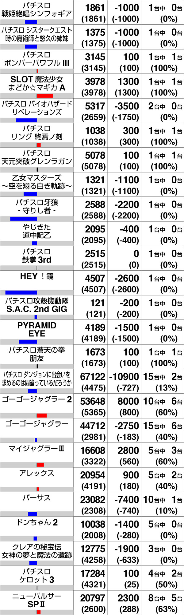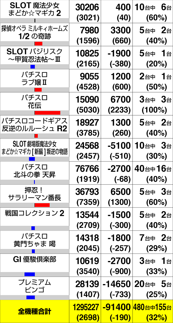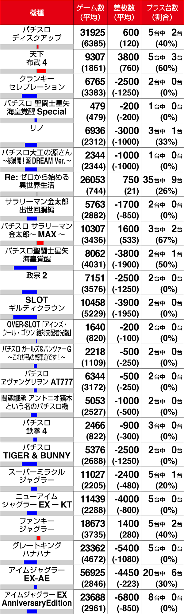 パチスロ全体で155台がプラスを記録し、そのうちの15台が3000ptオーバー。2台以上設置の機種は13機種がプラス台数割合が50%を上回った。