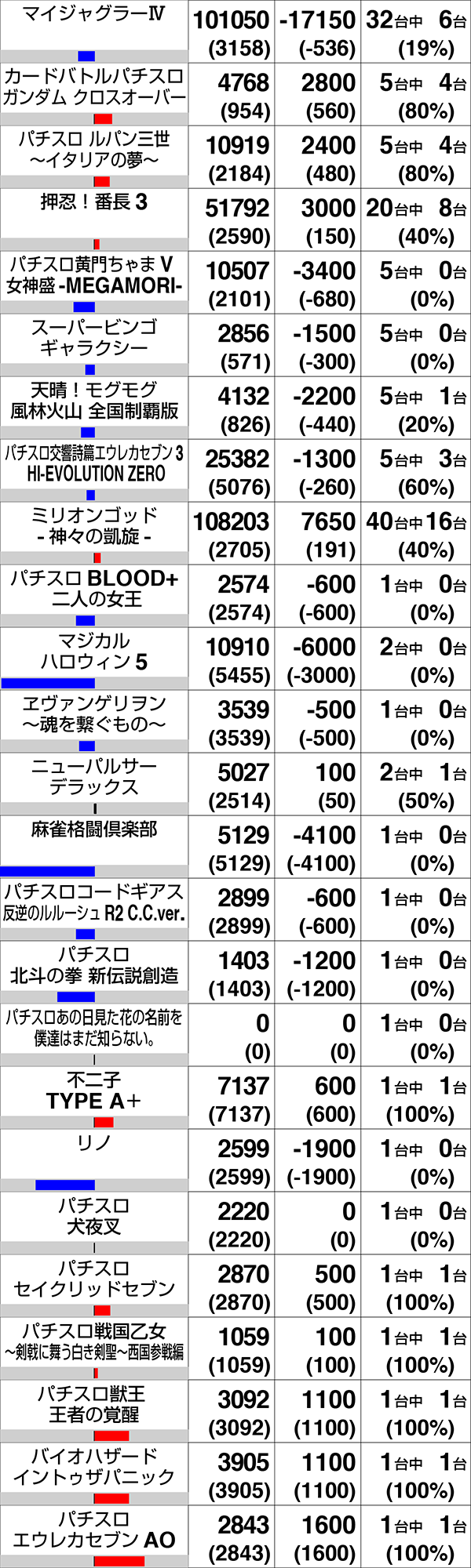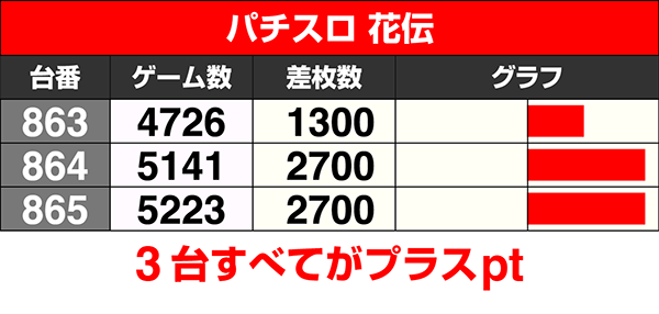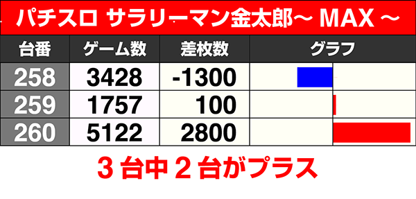 『パチスロ サラリーマン金太郎~MAX~』は3台中2台がプラスで、新台の『パチスロ 花伝』は3台すべてがプラス。