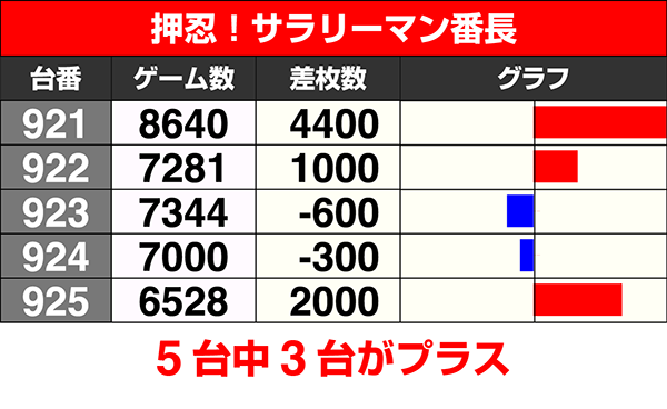 『押忍!サラリーマン番長』は5台中3台がプラスを記録し、平均ゲーム数は7000Gを超えた。