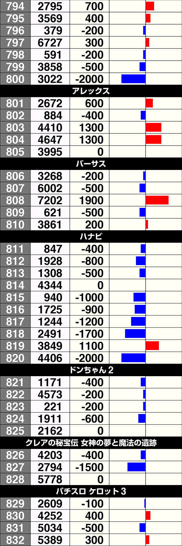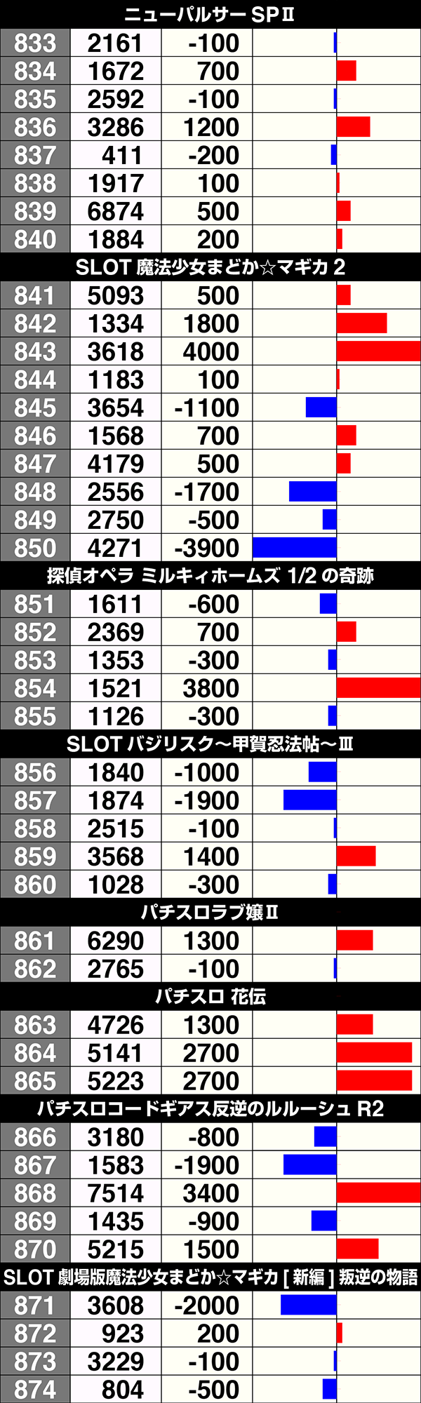 『SLOT魔法少女まどか☆マギカ2』は10台中6台がプラス。841番台から844番台までが4台並びでプラスを記録し、843番台は4000ptであった。