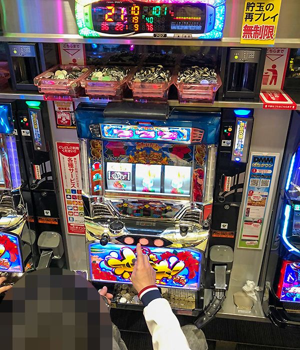 10円・5円パチスロの様子をうかがうと、様々な機種で楽しそうにレバーを叩くプレイヤーが見受けられた。