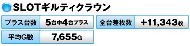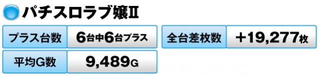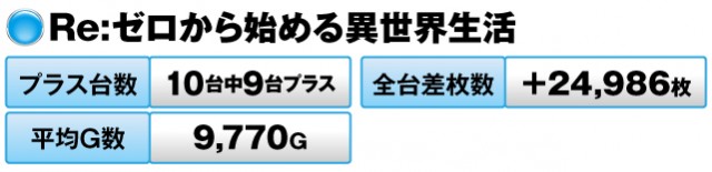 10台中9台がプラスで全台差枚数は+24,986枚、平均G数は9,770Gに及んだ。