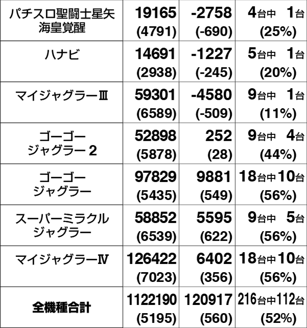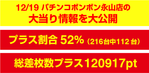 12月19日の「パチンコボンボン永山店」は、パチスロ全体で216台中112台がプラスを記録。