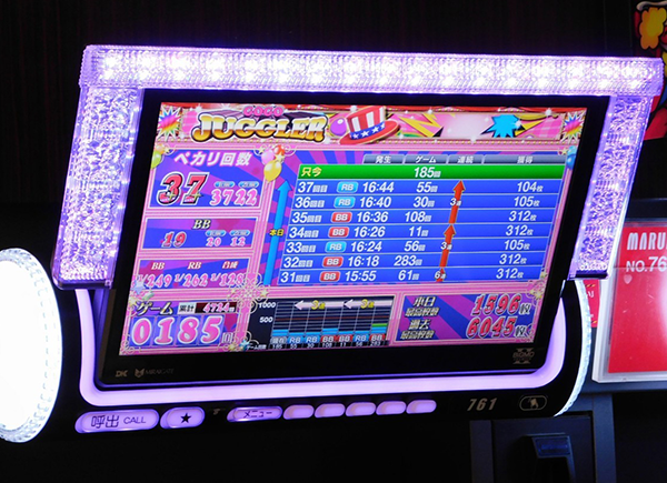 にぎやかな光景のほかに、17時の時点で38回のボーナスに到達している台も確認済みだ。
