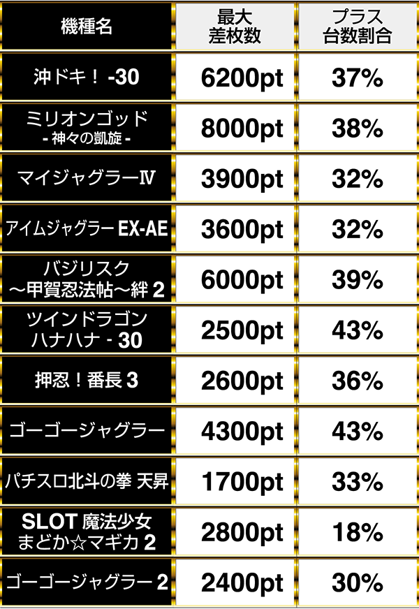 高稼働であった『ミリオンゴッド-神々の凱旋-』もプラスptの割合が3割を上回った。