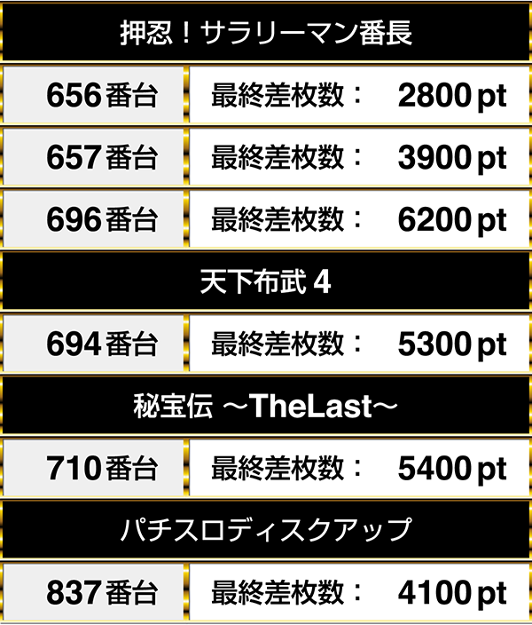 最終差枚数が1000pt以下の機種はなく、1機種は8000ptを記録した。