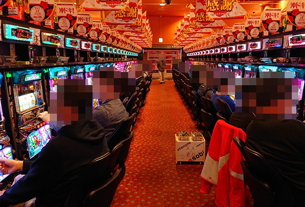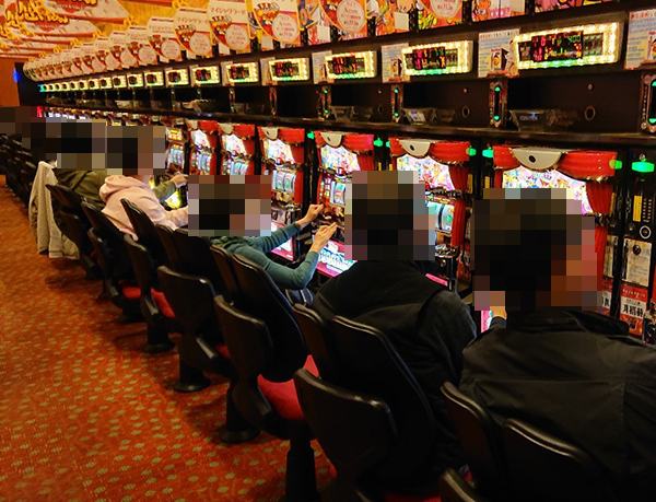 16時頃の店内では、幅広い年齢層のプレイヤーが遊技をおこなっており、ホール全体がにぎやかな状況。