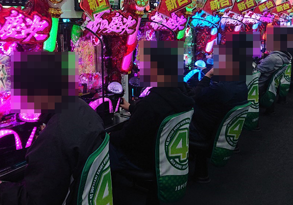 午後の4円パチンコでは、ほぼ満席の「P花の慶次~蓮」が盛況。活躍をしているプレイヤーが並んでいる光景は見応えがあり、ひときわ目立っていた。