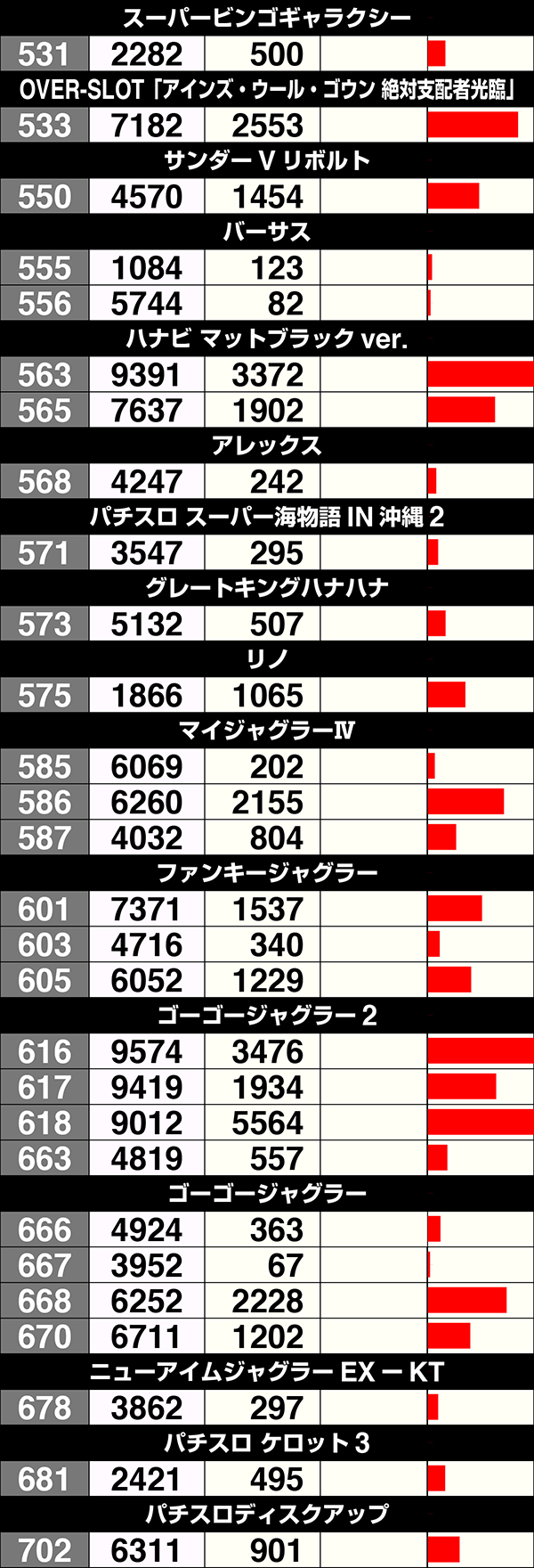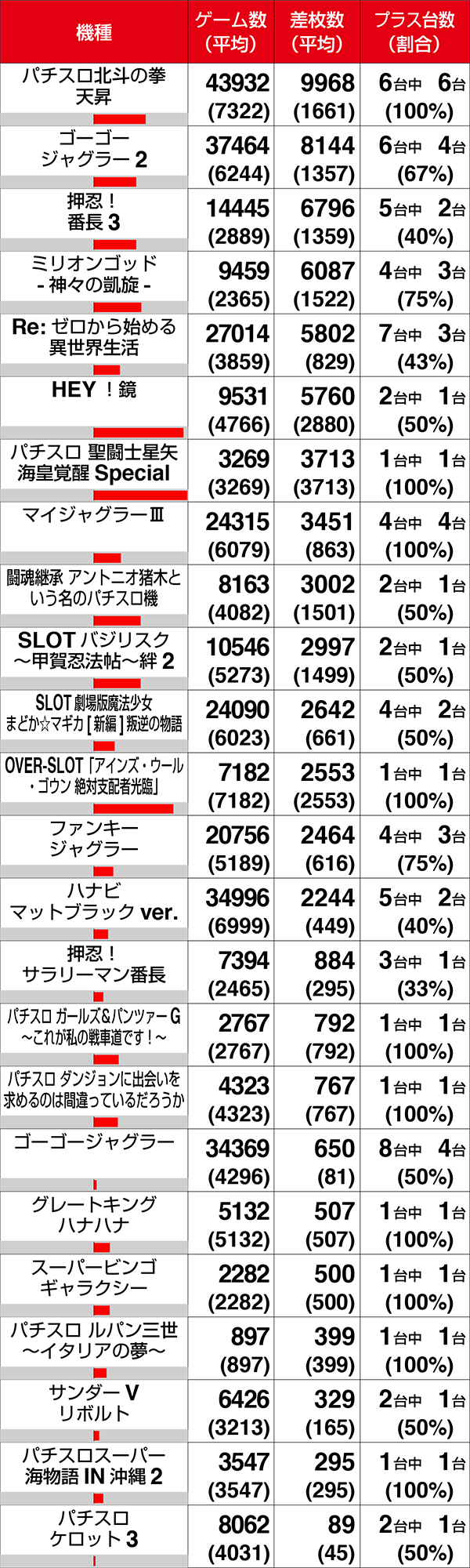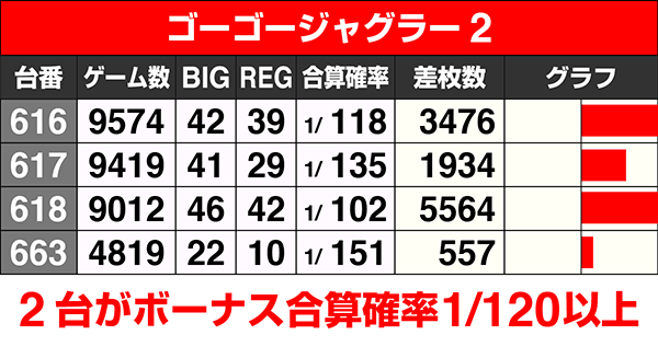 『ゴーゴージャグラー2』は4台がプラスで、2台は差枚数3000pt超。3台はゲーム数が9000Gオーバーと、支持率の高さも群を抜いていた。