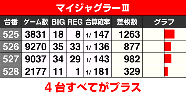 全台がプラスを記録した機種もあり、トータル差枚数は+15000ptを上回った。