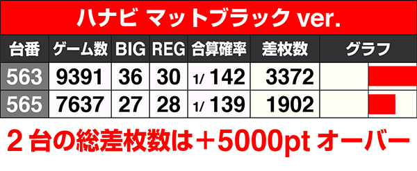 『ハナビ マットブラックver.』は2台がプラスで、どちらの台もボーナス合算確率が設定6の数値を上回った。