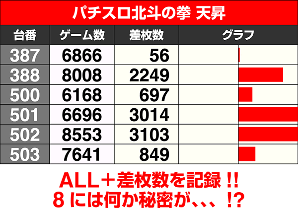 『パチスロ北斗の拳 天昇』はすべての台がプラスをマークし、トータル差枚数は9968pt。