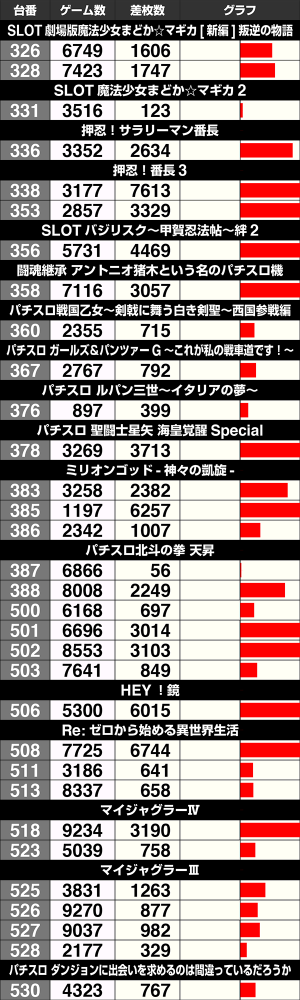 この日もっとも多い差枚数を記録したのは、『押忍!番長3』の7613ptであった。