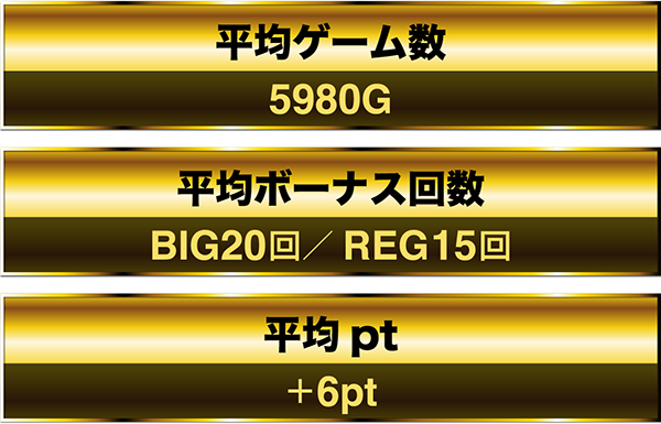 1日を通した機種全体の平均ゲーム数は5980Gで、平均ボーナス回数は約35回。平均ptはプラスを記録した。