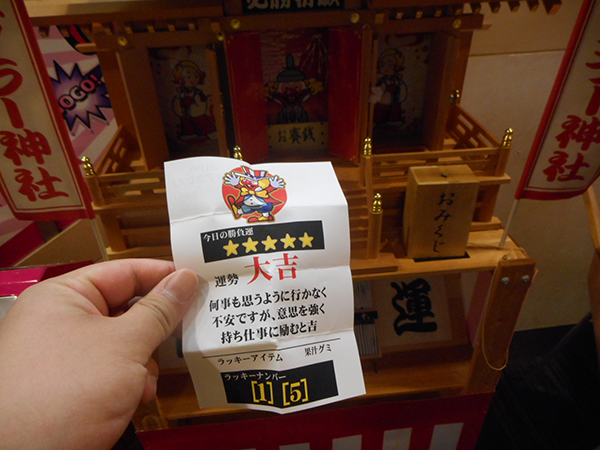 また、ジャグラーコーナーにある神社で、おみくじをひいてみたところ大吉をひくことができた。ラッキーナンバーなども書いてあるため、運試しをしつつ台選びの参考にしてみても面白いだろう。