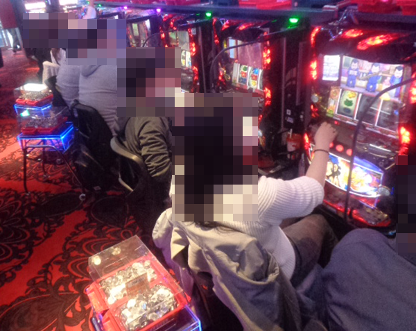 滞在中は設置されている11台が満席を維持。うれしそうにレバーを叩き続けている姿が魅力的であった。