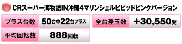 50台中22台がプラスで、全台差枚数は+30,550発だった。
