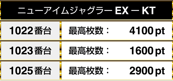 『ニューアイムジャグラーEXーKT』には4100pt、1600pt、2900ptが並ぶ!