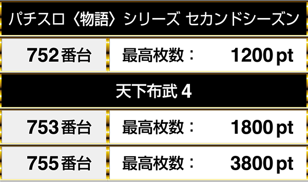 閉店時には752番台から755番台までの3台が連なってプラスptとなり、すべてが1000pt以上であった。