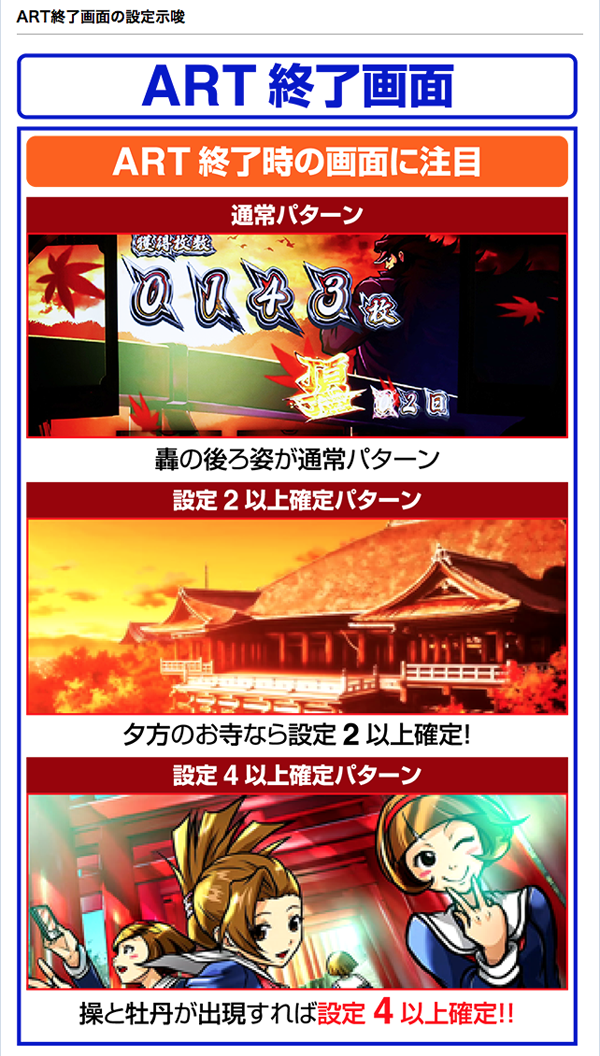 また、ART終了時の画面も要チェック。夕方のお寺なら設定2以上、操と牡丹が出現すれば設定4以上が濃厚となる。