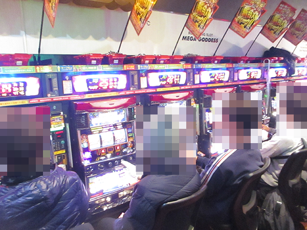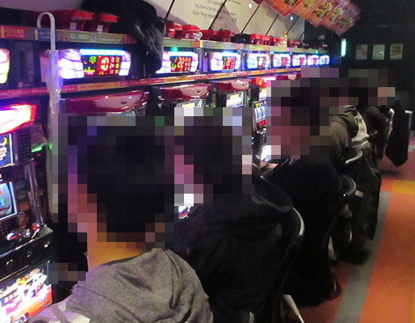 店内でひときわ目立っていたのが15台設置の「ファンキージャグラー」。すべての台が埋まっており、うれしそうにレバーを叩く姿がズラリと並んでいた。